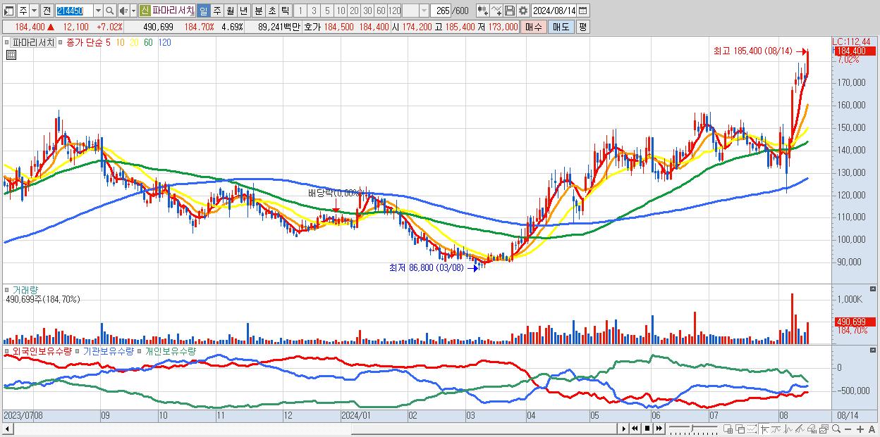- 파마리서치 (184,400원 ▲ 7.02% , 시총: 19,275억, 거래량: 490,699, 거래대금:892억, KOSDAQ)