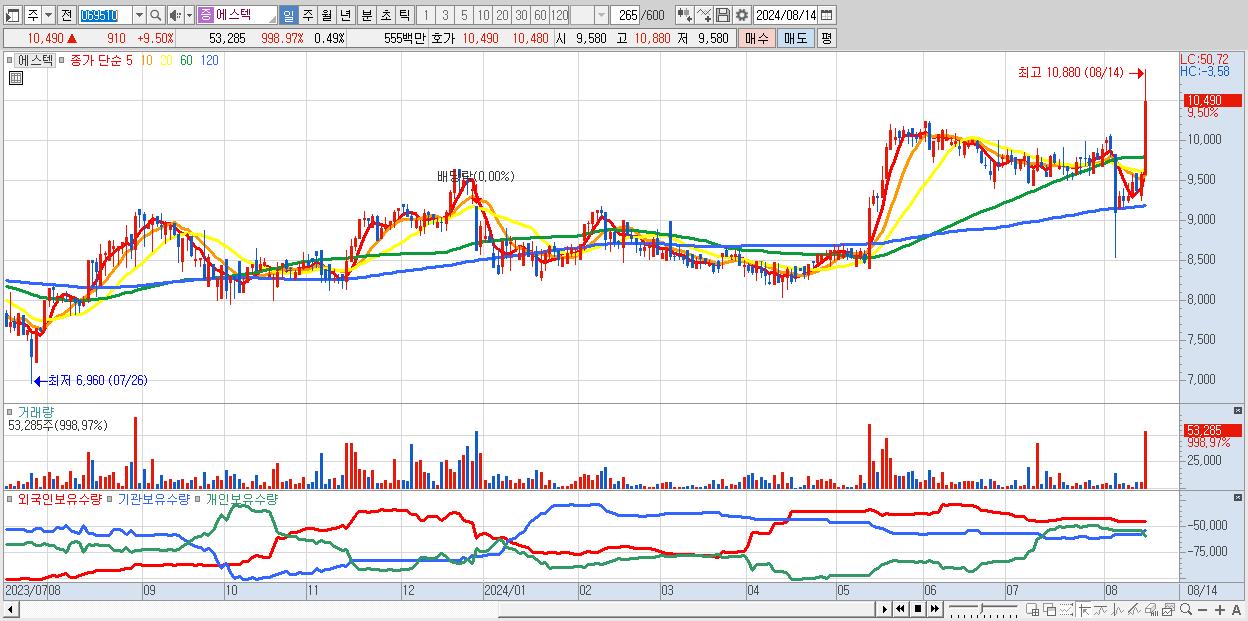 - 에스텍 (10,490원 ▲ 9.5% , 시총: 1,144억, 거래량: 53,285, 거래대금:6억, KOSDAQ)