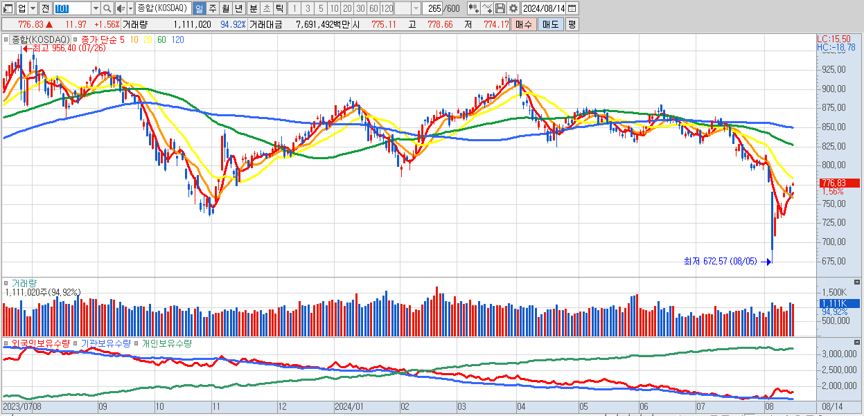 | 08/14 | 776.83 | ▲1.56% | -807억 | 828억 | 8억 | -29억 |