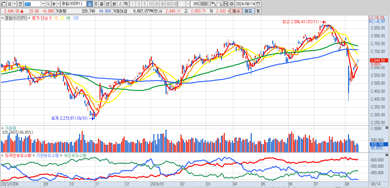 | 08/14 | 2,644.50 | ▲0.88% | -3,162억 | 3,901억 | -1,143억 | 405억 |