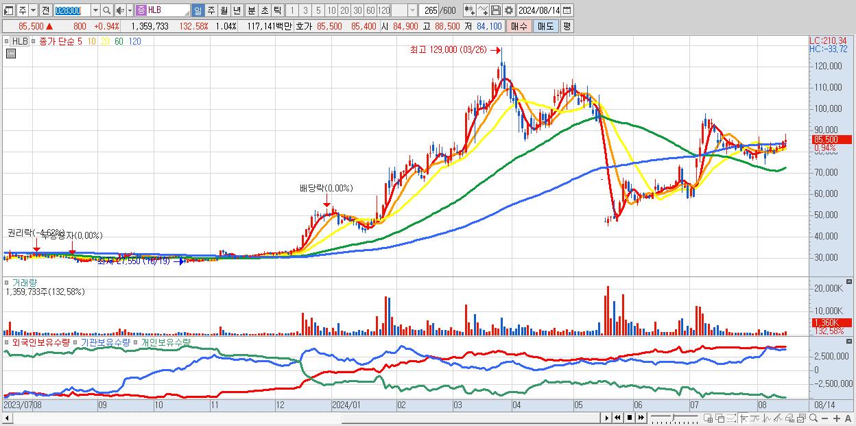- HLB (85,500원 ▲ 0.94% , 시총: 111,873억, 거래량: 1,359,733, 거래대금:1,171억)