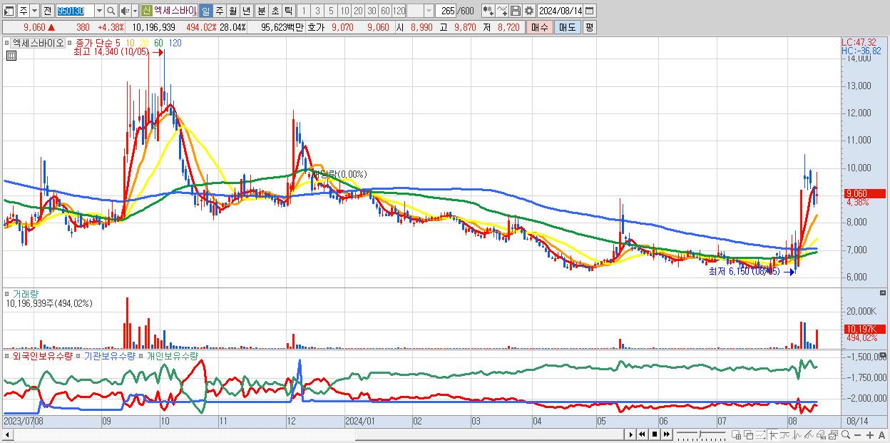 - 엑세스바이오 (9,060원 ▲ 4.38% , 시총: 3,295억, 거래량: 10,196,939, 거래대금:956억)