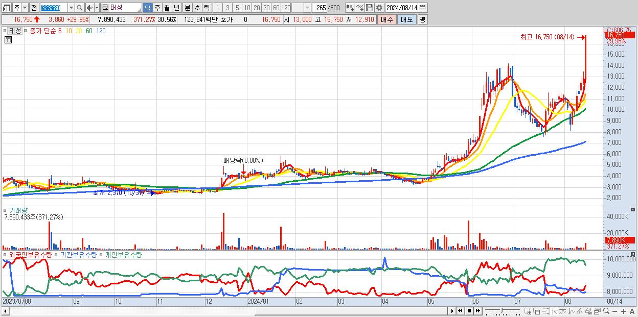 - 태성 (16,750원 ▲ 29.95% , 시총: 4,325억, 거래량: 7,890,433, 거래대금:1,236억)