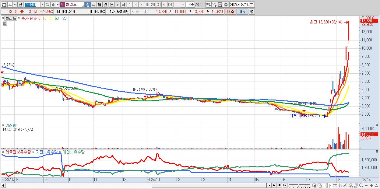 - 셀리드 (13,320원 ▲ 29.95% , 시총: 1,812억, 거래량: 14,031,319, 거래대금:1,726억)