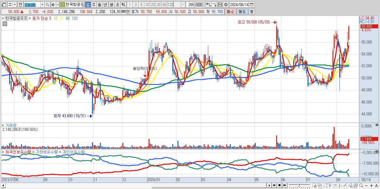 - 한국항공우주 (58,600원 ▲ 4.83% , 시총: 57,120억, 거래량: 2,148,286, 거래대금:1,249억)