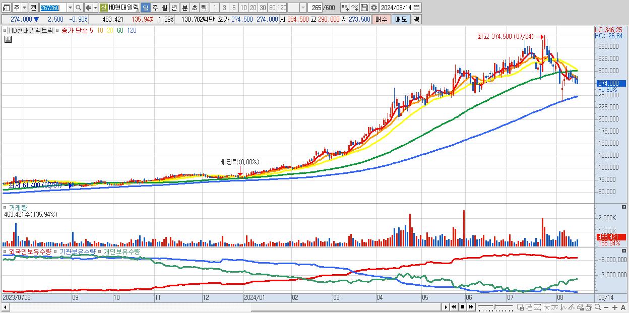 - HD현대일렉트릭 (274,000원 ▼ -0.9% , 시총: 98,769억, 거래량: 463,421, 거래대금:1,308억)