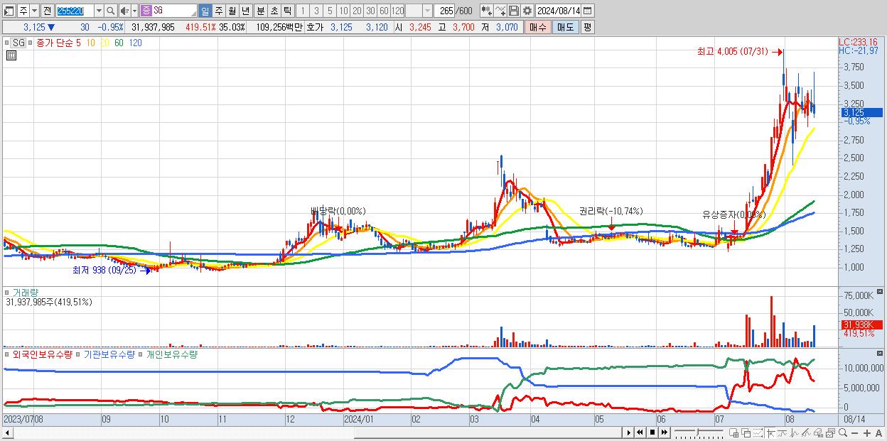 - SG (3,125원 ▼ -0.95% , 시총: 2,849억, 거래량: 31,937,985, 거래대금:1,093억)
