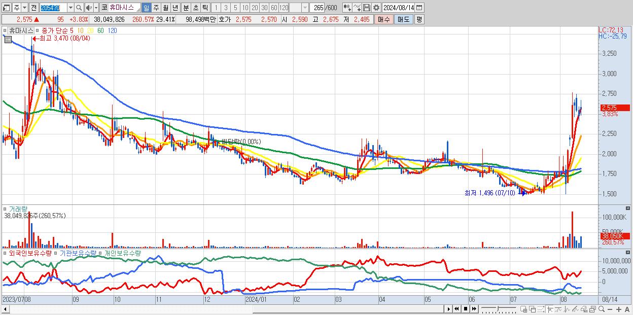 - 휴마시스 (2,575원 ▲ 3.83% , 시총: 3,331억, 거래량: 38,049,826, 거래대금:985억)