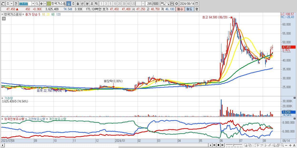 - 한국가스공사 (47,450원 ▲ 0.96% , 시총: 43,803억, 거래량: 3,625,409, 거래대금:1,731억)