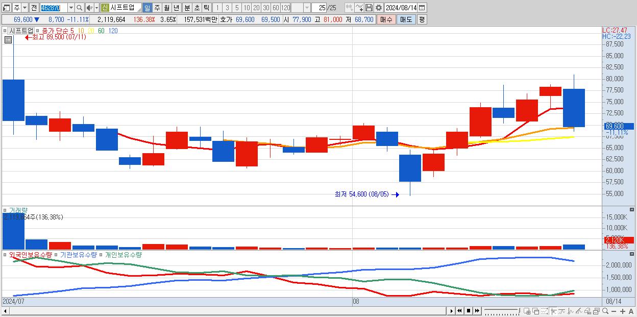 - 시프트업 (69,600원 ▼ -11.11% , 시총: 40,386억, 거래량: 2,119,664, 거래대금:1,575억)