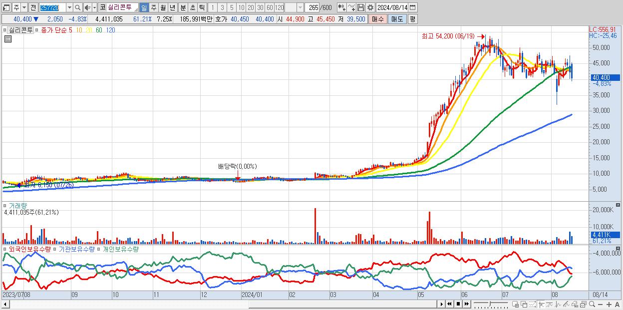 - 실리콘투 (40,400원 ▼ -4.83% , 시총: 24,593억, 거래량: 4,411,035, 거래대금:1,860억)