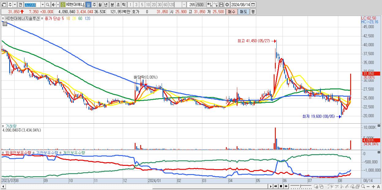 - HD현대에너지솔루션 (31,850원 ▲ 30% , 시총: 3,567억, 거래량: 4,090,840, 거래대금:1,220억)