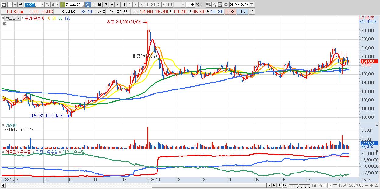- 셀트리온 (194,600원 ▲ 0.99% , 시총: 422,323억, 거래량: 677,058, 거래대금:1,309억)