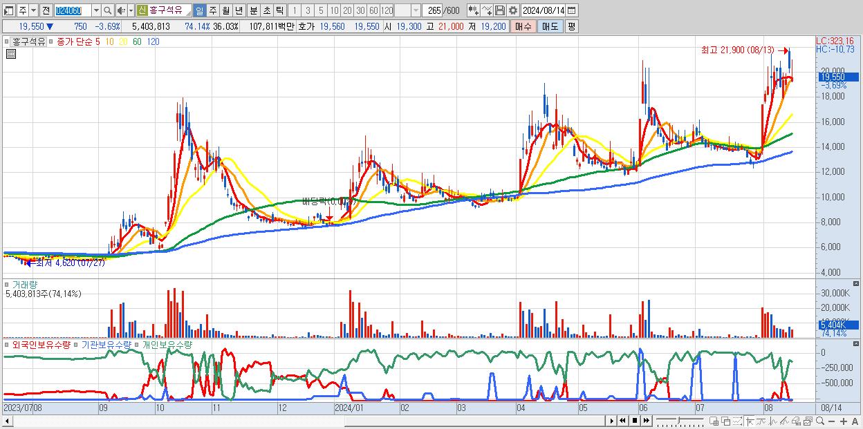 - 흥구석유 (19,550원 ▼ -3.69% , 시총: 2,933억, 거래량: 5,403,813, 거래대금:1,078억)