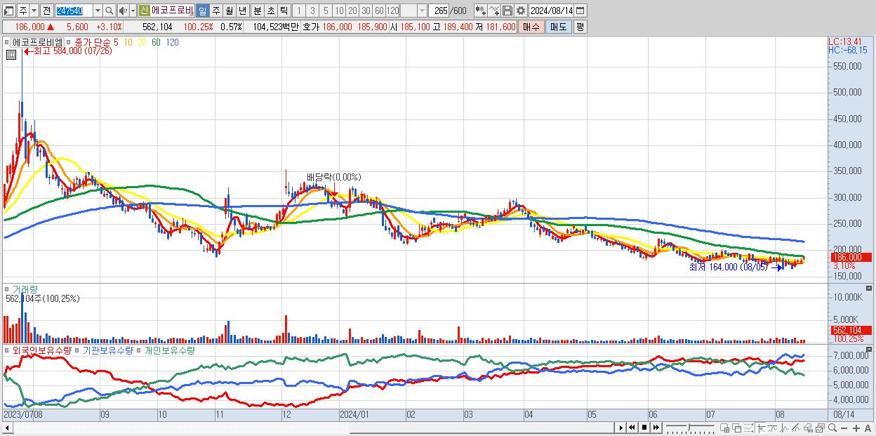 - 에코프로비엠 (186,000원 ▲ 3.1% , 시총: 181,910억, 거래량: 562,104, 거래대금:1,045억)