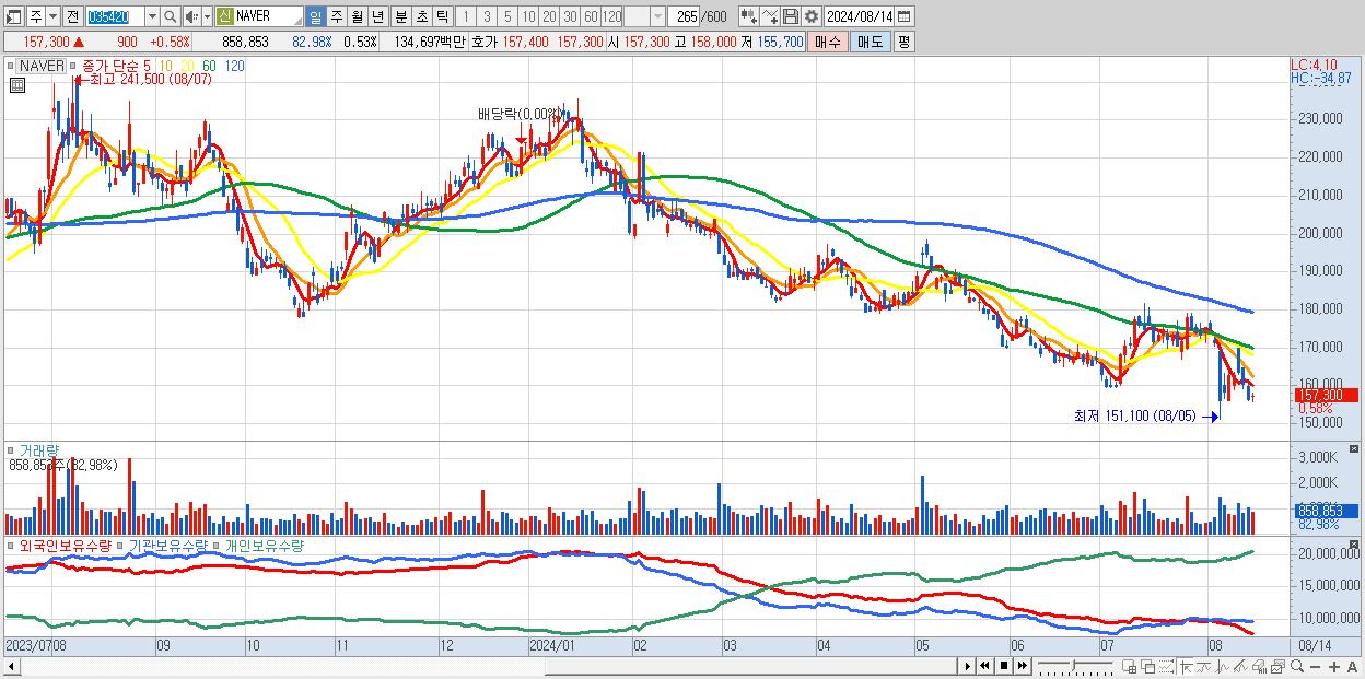 - NAVER (157,300원 ▲ 0.58% , 시총: 255,469억, 거래량: 858,853, 거래대금:1,347억)