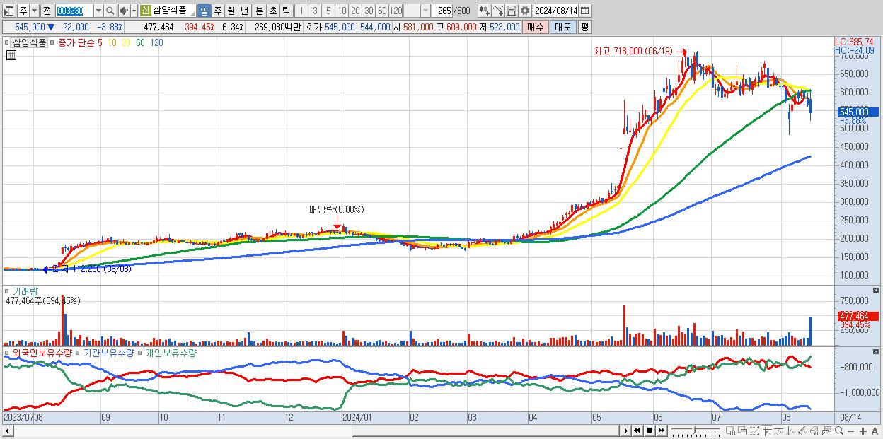 - 삼양식품 (545,000원 ▼ -3.88% , 시총: 41,055억, 거래량: 477,464, 거래대금:2,691억)