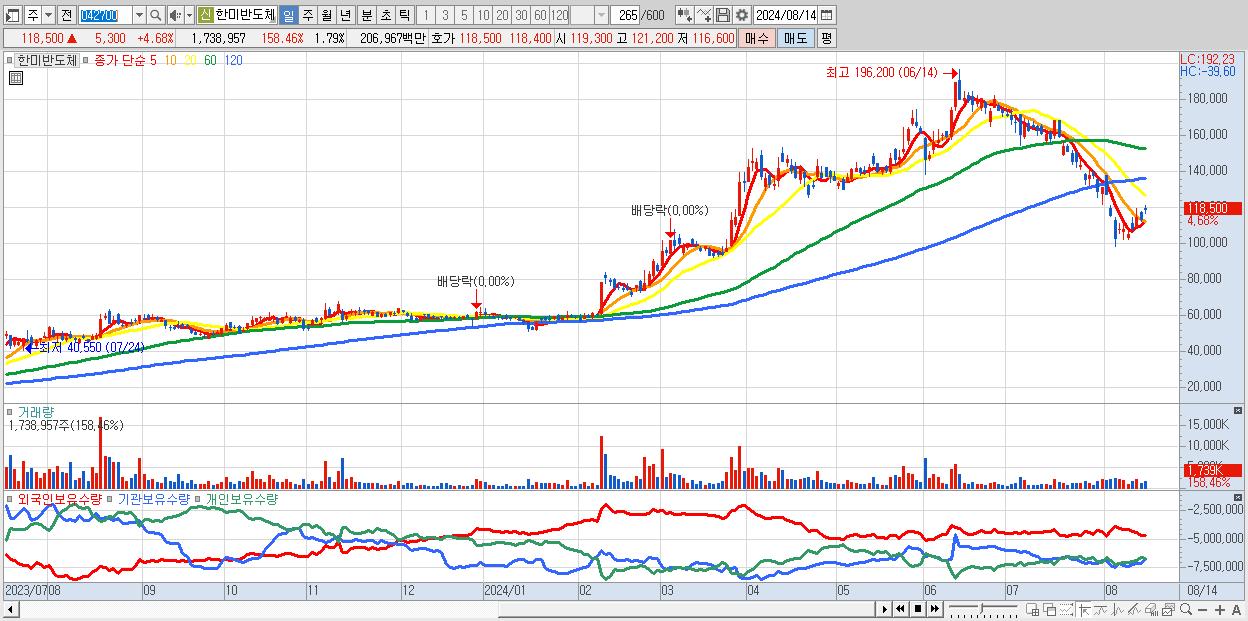 - 한미반도체 (118,500원 ▲ 4.68% , 시총: 114,937억, 거래량: 1,738,957, 거래대금:2,070억)