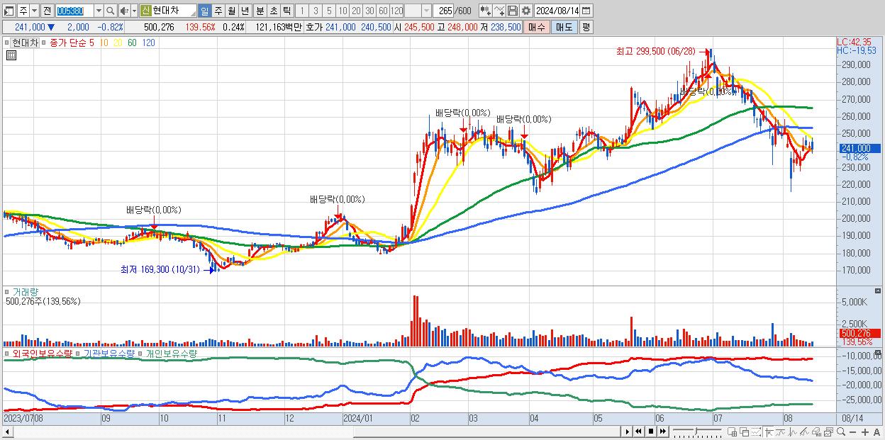 - 현대차 (241,000원 ▼ -0.82% , 시총: 504,693억, 거래량: 500,276, 거래대금:1,212억)