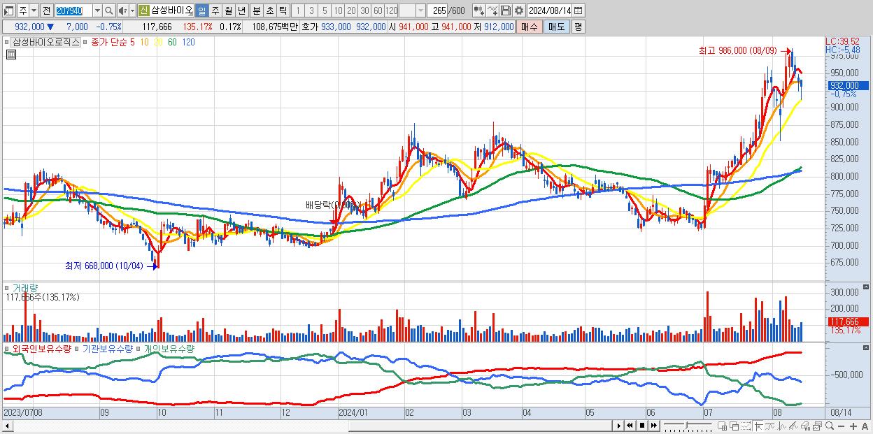 - 삼성바이오로직스 (932,000원 ▼ -0.75% , 시총: 663,342억, 거래량: 117,666, 거래대금:1,087억)