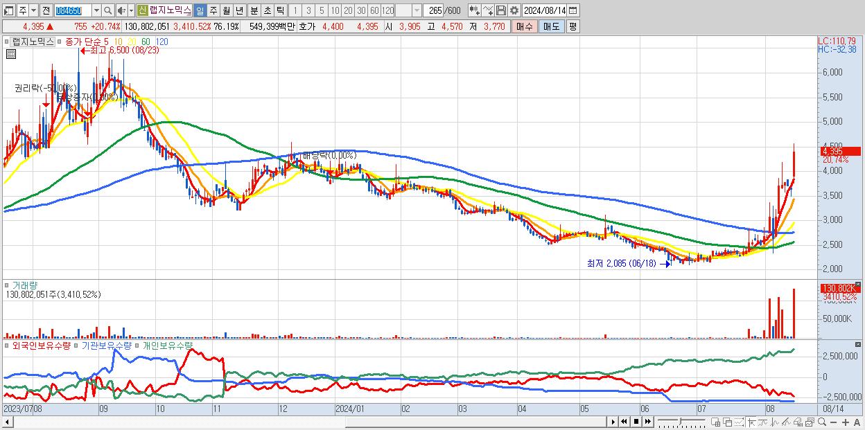 - 랩지노믹스 (4,395원 ▲ 20.74% , 시총: 3,263억, 거래량: 130,802,051, 거래대금:5,494억)