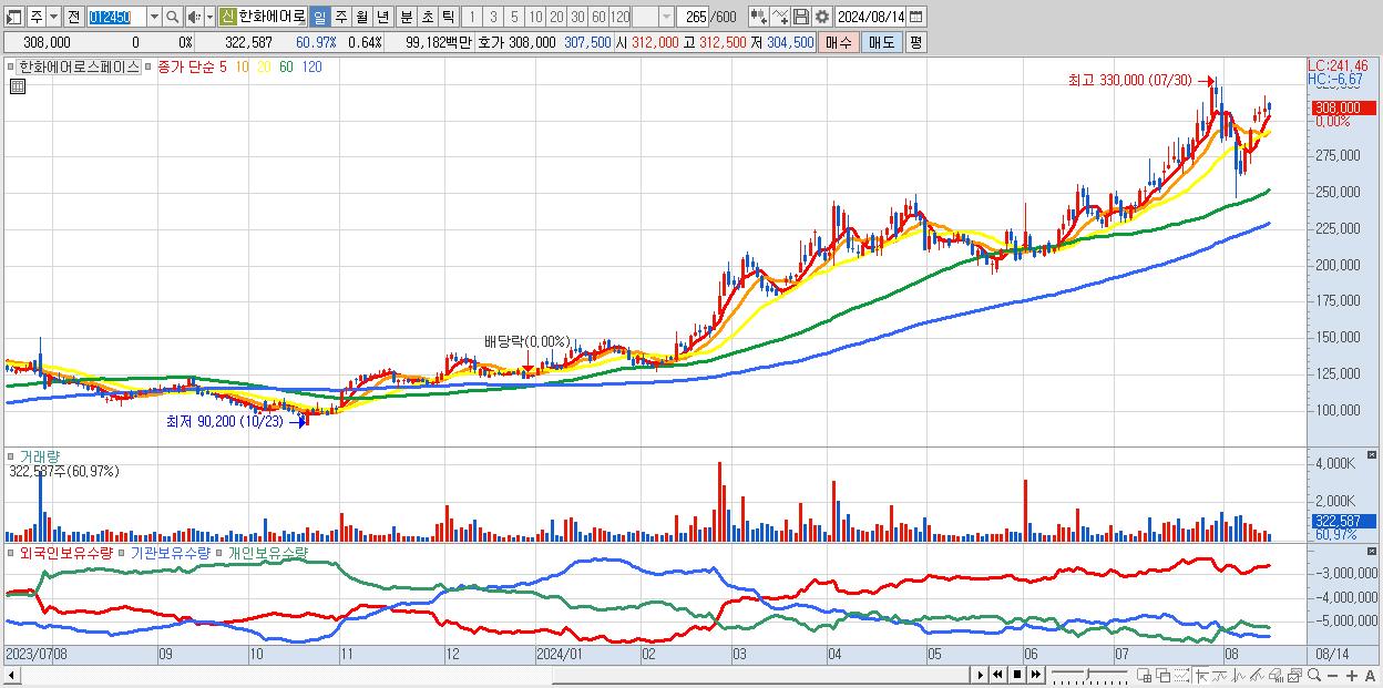 - 한화에어로스페이스 (308,000원 0% , 시총: 155,940억, 거래량: 322,587, 거래대금:992억)