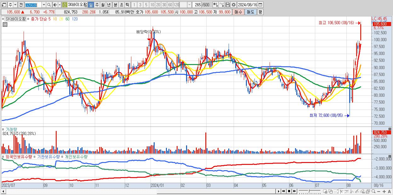 - SK바이오팜 (105,600원 ▲ 6.77% , 시총: 82,699억, 외국인 순매수 거래금:250억)