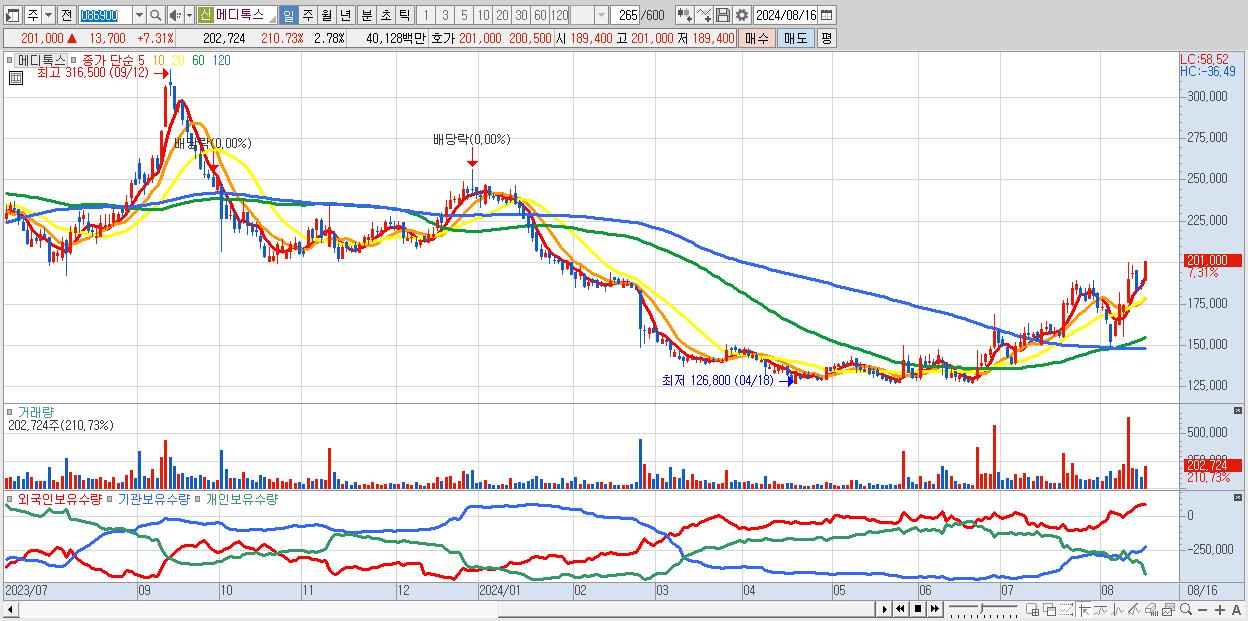- 메디톡스 (201,000원 ▲ 7.31% , 시총: 14,670억, 외국인 순매수 거래금:95억)
