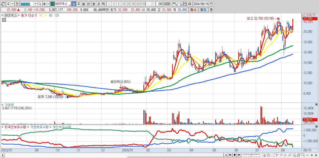 - 바이넥스 (22,500원 ▲ 10.29% , 시총: 7,146억, 외국인 순매수 거래금:110억)