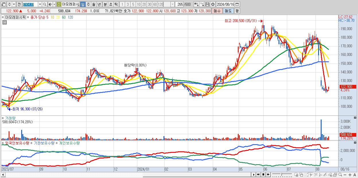 - 아모레퍼시픽 (122,900원 ▲ 4.24% , 시총: 71,888억, 외국인 순매수 거래금:120억)