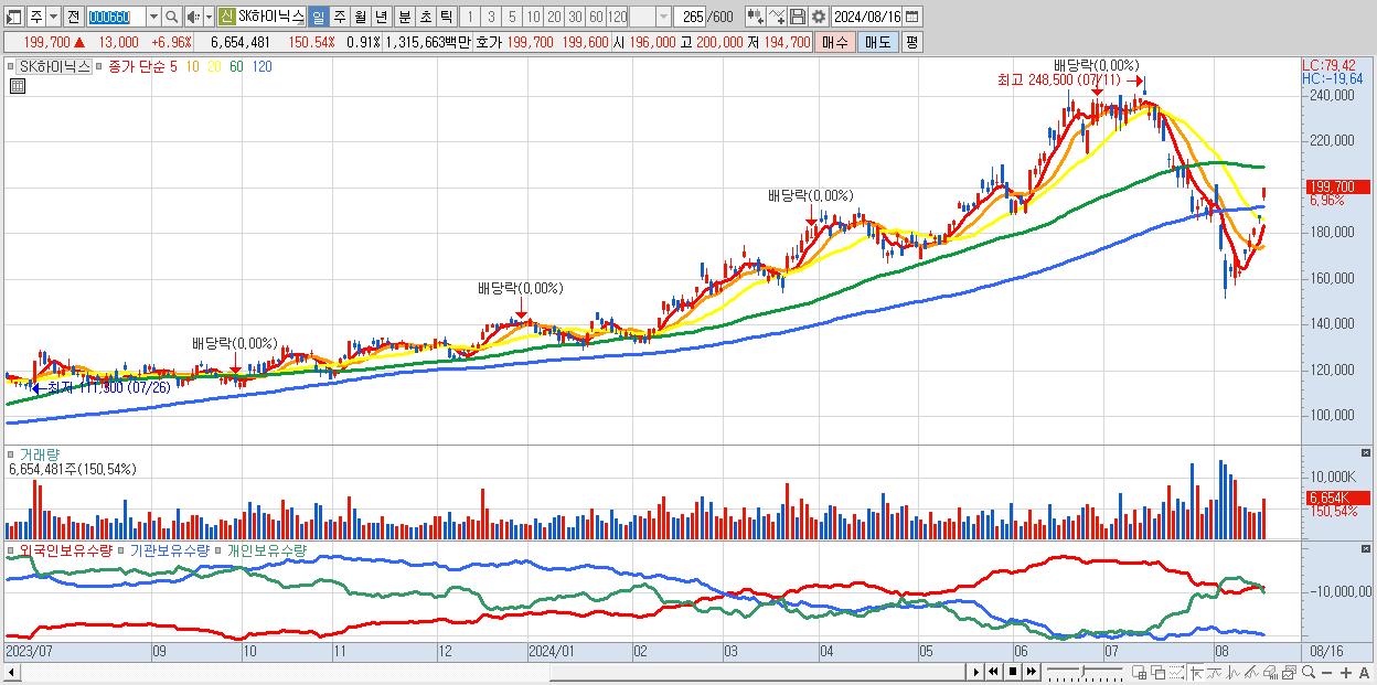 - SK하이닉스 (199,700원 ▲ 6.96% , 시총: 1,453,821억, 외국인 순매수 거래금:3,925억)
