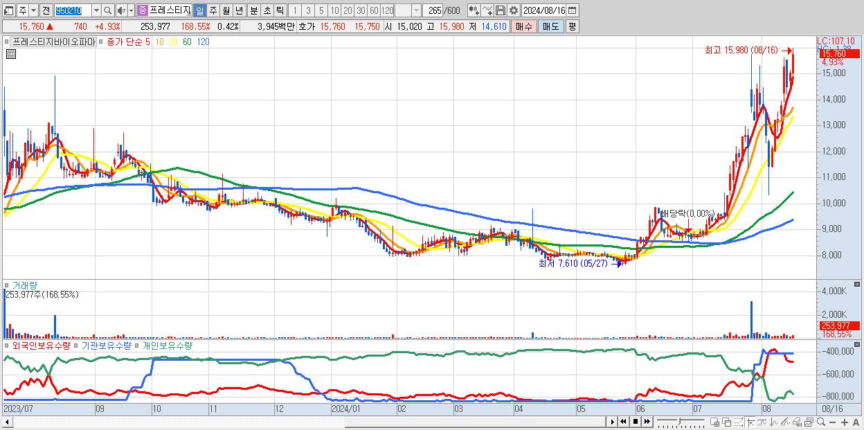 - 프레스티지바이오파마 (15,760원 ▲ 4.93% , 시총: 9,471억, 거래량: 253,977, 거래대금:39억, KOSPI)