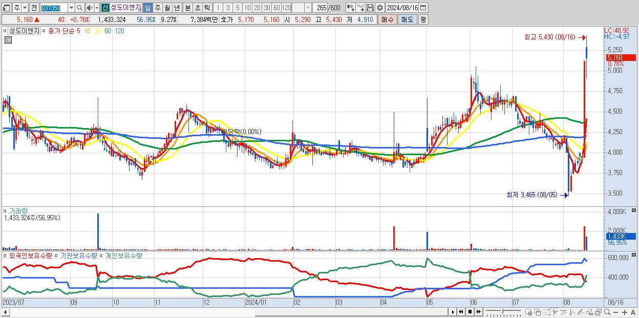 - 성도이엔지 (5,160원 ▲ 0.78% , 시총: 798억, 거래량: 1,433,324, 거래대금:74억, KOSDAQ)