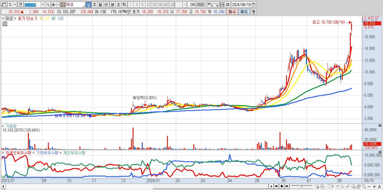 - 태성 (18,310원 ▲ 9.31% , 시총: 4,728억, 거래량: 10,103,287, 거래대금:1,792억, KOSDAQ)