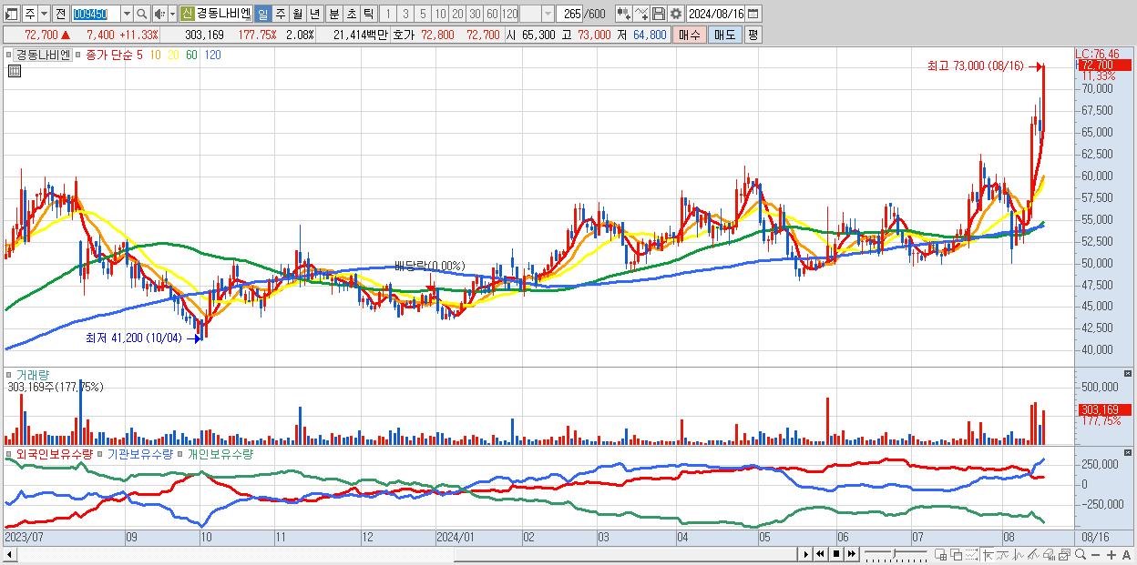 - 경동나비엔 (72,700원 ▲ 11.33% , 시총: 10,591억, 거래량: 303,169, 거래대금:214억, KOSPI)