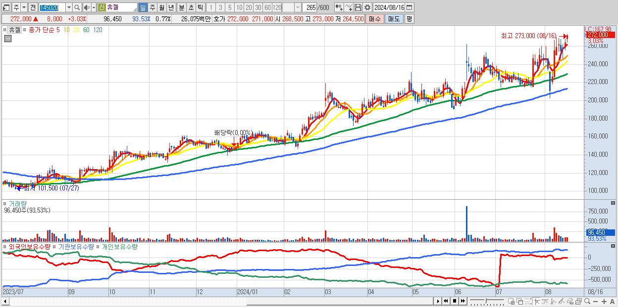 - 휴젤 (272,000원 ▲ 3.03% , 시총: 34,283억, 거래량: 96,450, 거래대금:261억, KOSDAQ)