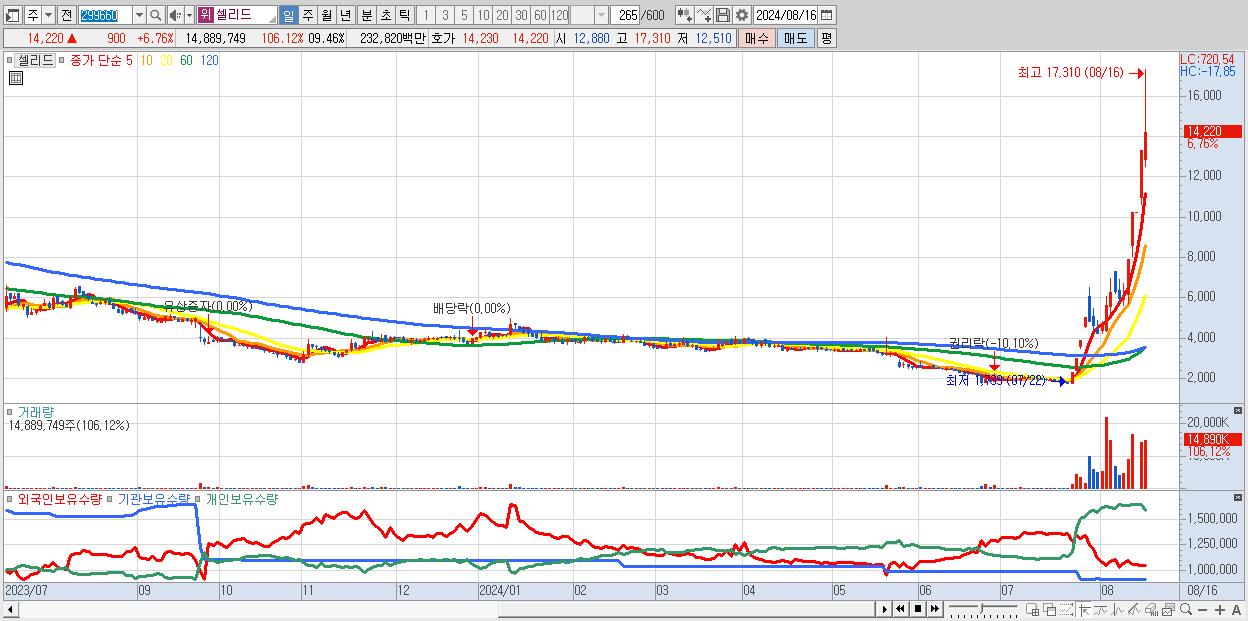 - 셀리드 (14,220원 ▲ 6.76% , 시총: 1,934억, 거래량: 14,889,749, 거래대금:2,328억, KOSDAQ)