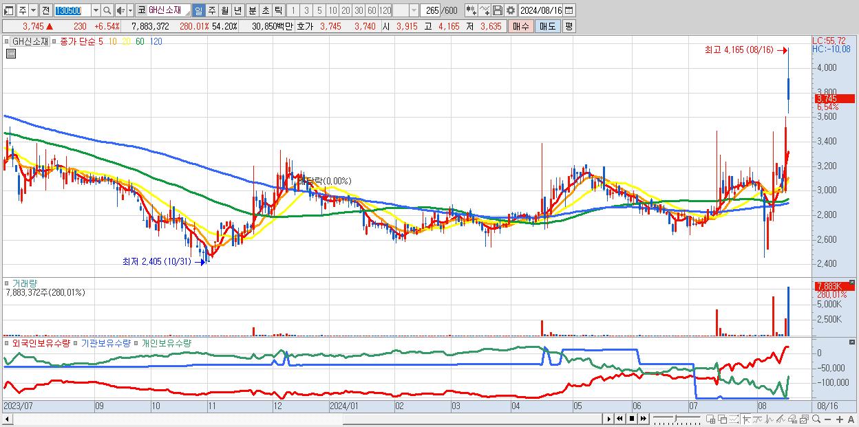 - GH신소재 (3,745원 ▲ 6.54% , 시총: 545억, 거래량: 7,883,372, 거래대금:308억, KOSDAQ)