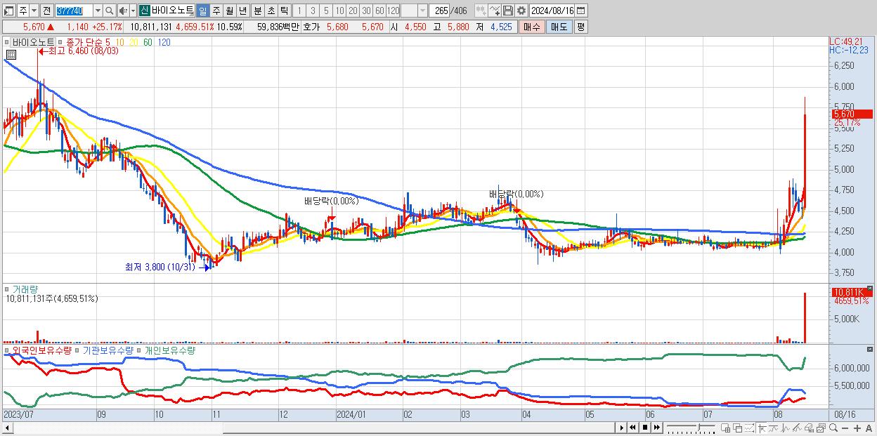 바이오노트 5,670원 ▲ 25.17% (KOSPI, 377740)