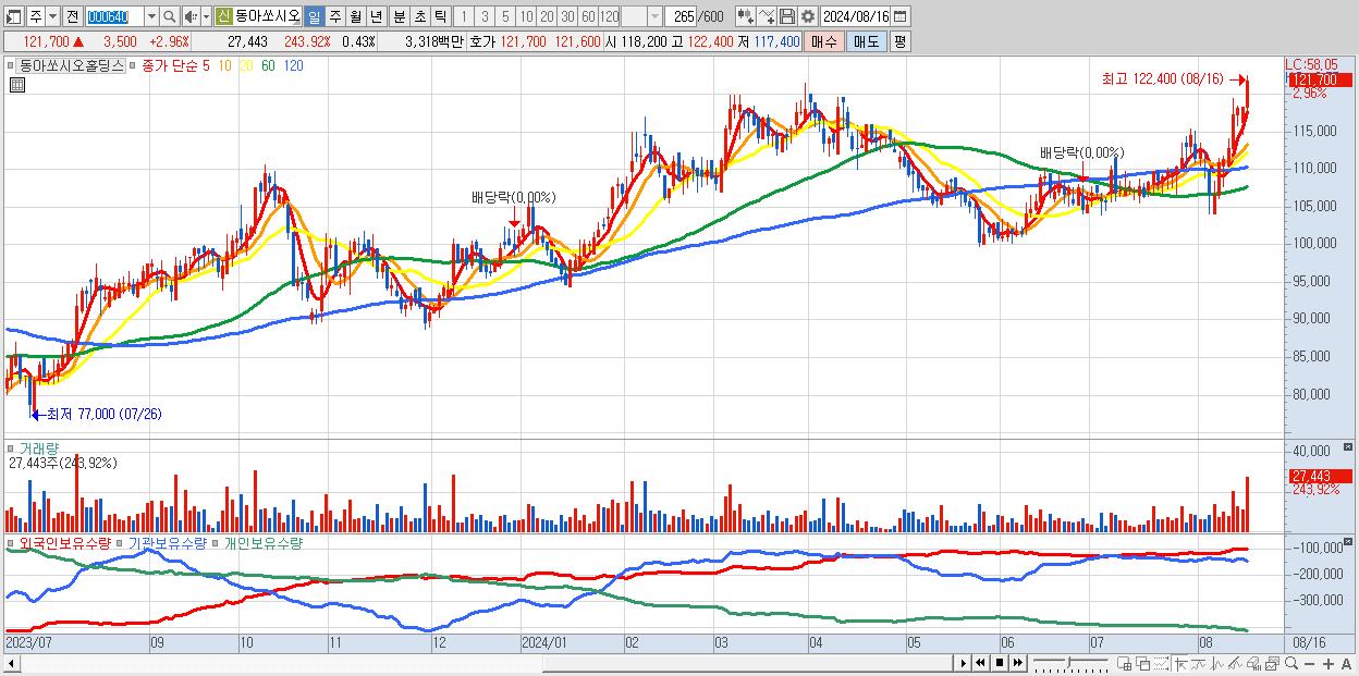 - 동아쏘시오홀딩스 (121,700원 ▲ 2.96% , 시총: 7,727억, 거래량: 27,443, 거래대금:33억, KOSPI)