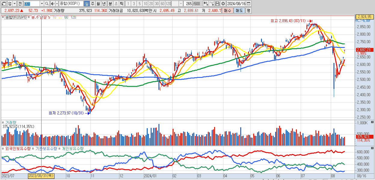 | 08/16 | 2,697.23 | ▲1.99% | -14,658억 | 12,055억 | 2,159억 | 445억 |
