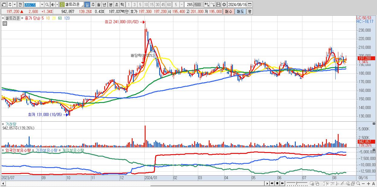- 셀트리온 (197,200원 ▲ 1.34% , 시총: 427,966억, 거래량: 942,857, 거래대금:1,870억)
