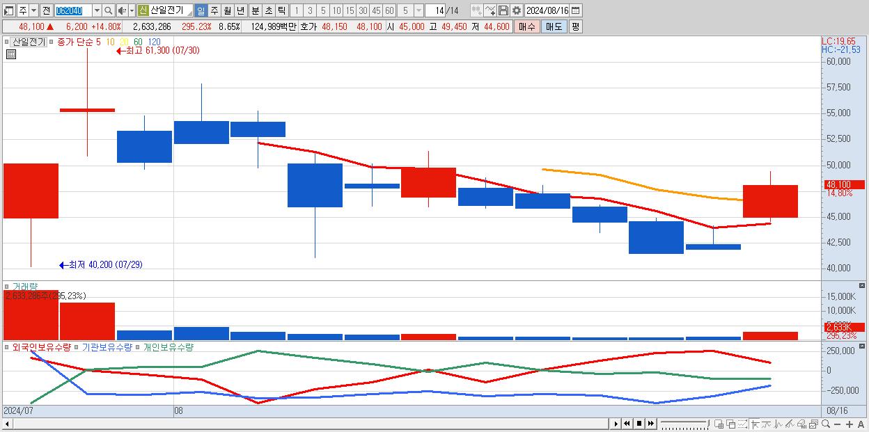 - 산일전기 (48,100원 ▲ 14.8% , 시총: 14,644억, 거래량: 2,633,286, 거래대금:1,250억)