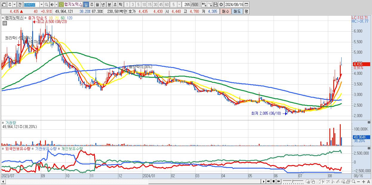 - 랩지노믹스 (4,435원 ▲ 0.91% , 시총: 3,293억, 거래량: 49,964,121, 거래대금:2,306억)