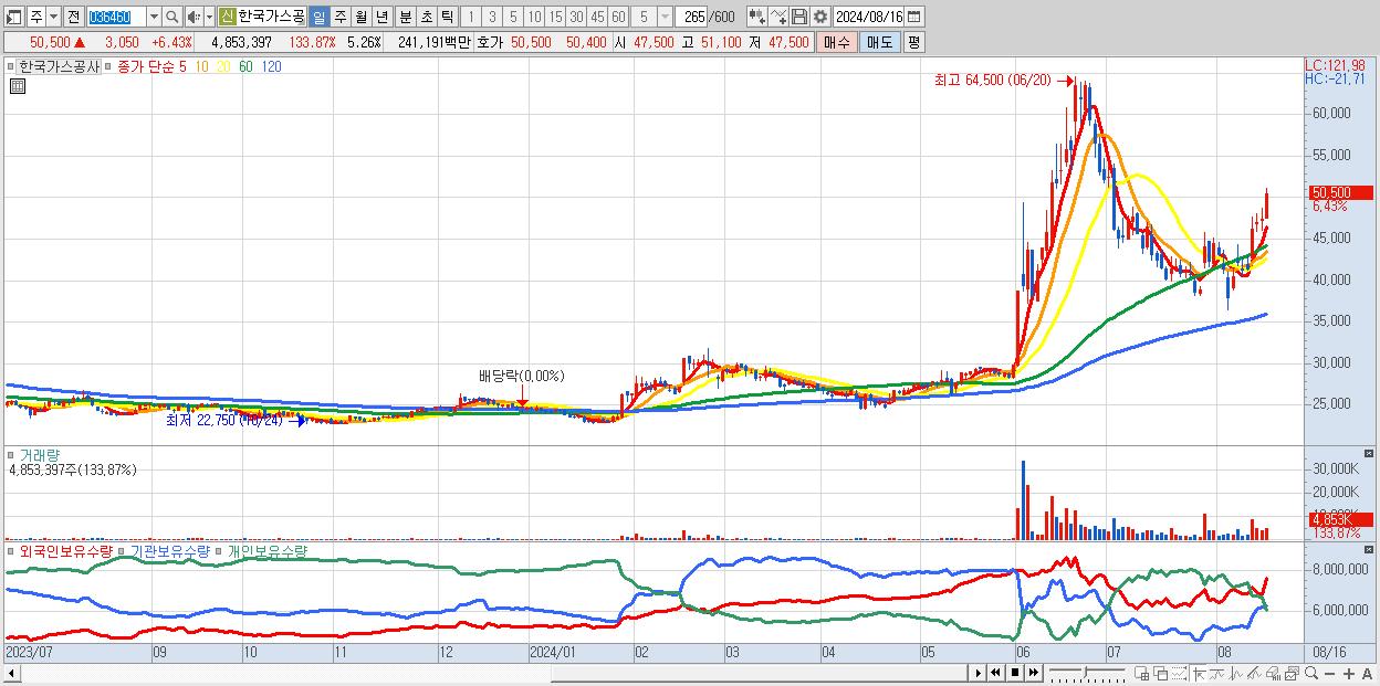 - 한국가스공사 (50,500원 ▲ 6.43% , 시총: 46,618억, 거래량: 4,853,397, 거래대금:2,412억)