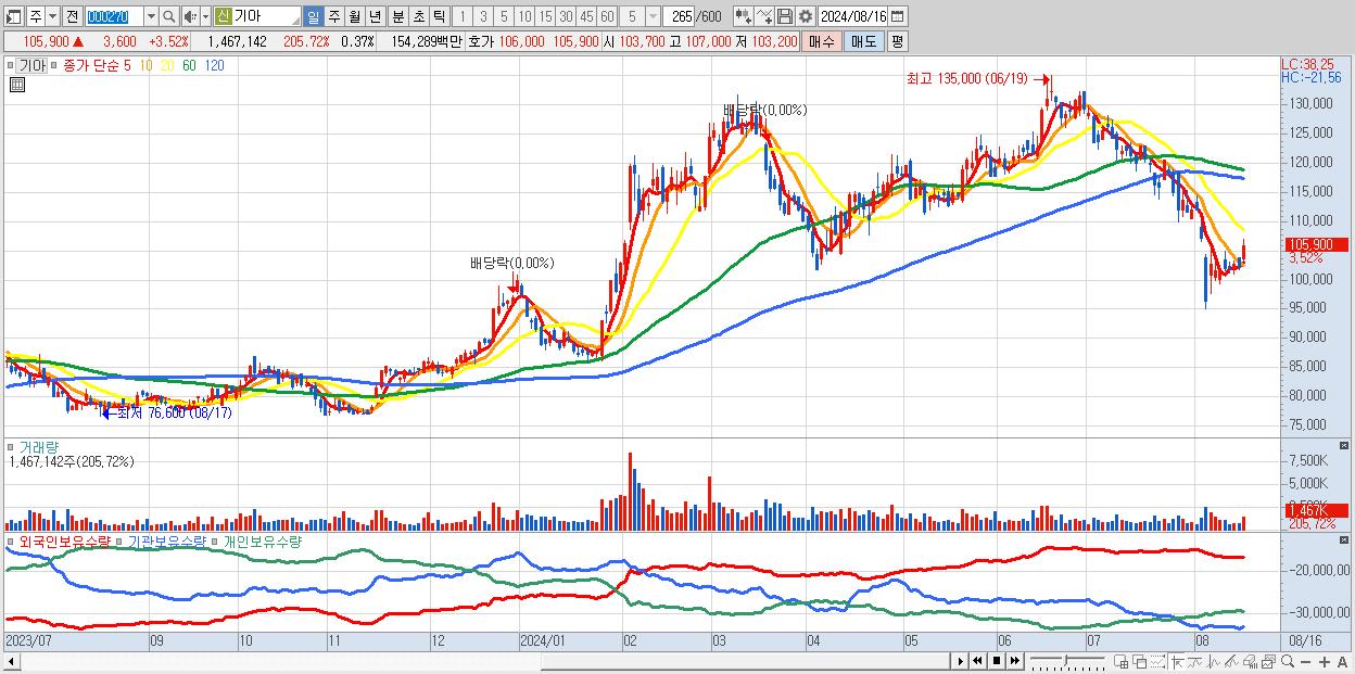 - 기아 (105,900원 ▲ 3.52% , 시총: 423,450억, 거래량: 1,467,142, 거래대금:1,543억)
