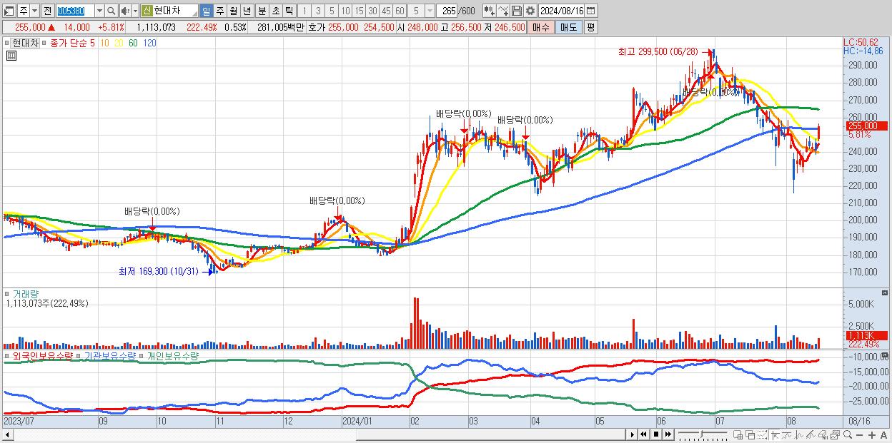 - 현대차 (255,000원 ▲ 5.81% , 시총: 534,011억, 거래량: 1,113,073, 거래대금:2,810억)
