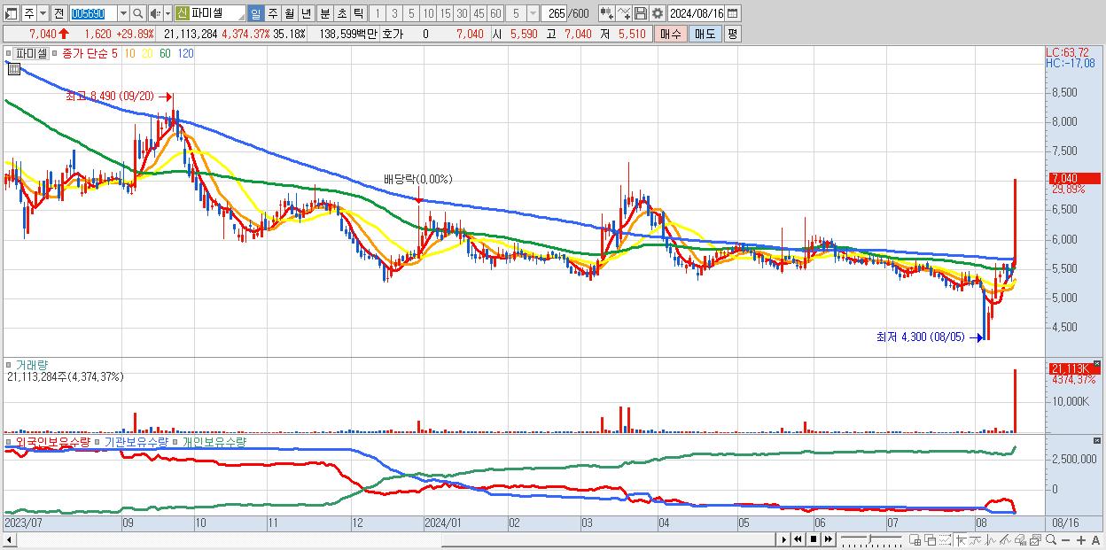 - 파미셀 (7,040원 ▲ 29.89% , 시총: 4,225억, 거래량: 21,113,284, 거래대금:1,386억)