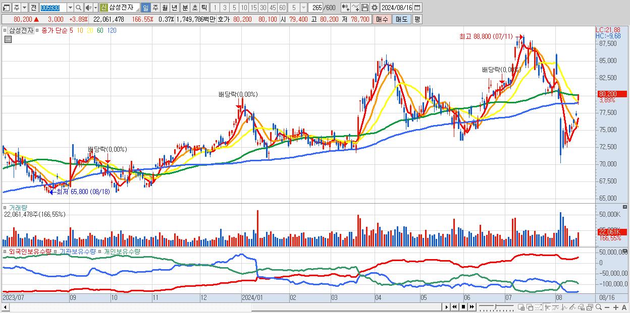 - 삼성전자 (80,200원 ▲ 3.89% , 시총: 4,787,766억, 거래량: 22,061,478, 거래대금:17,498억)