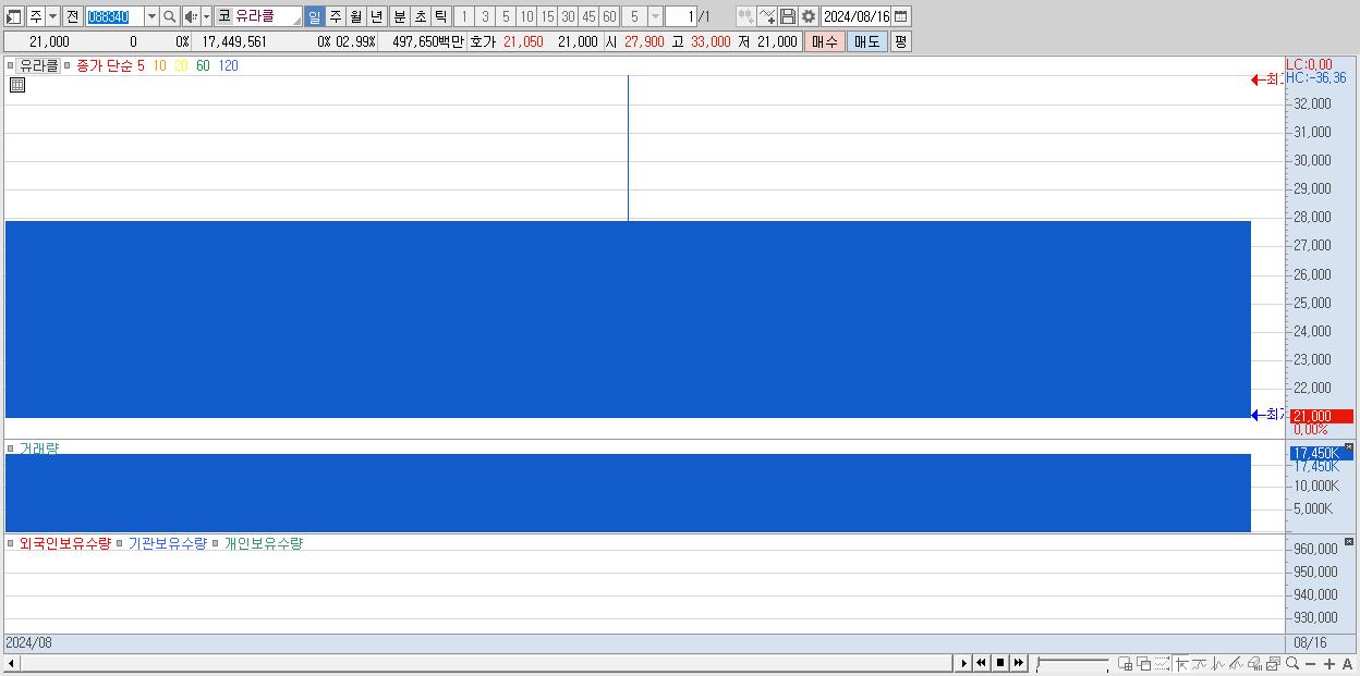 - 유라클 (21,000원 0% , 시총: 909억, 거래량: 17,449,561, 거래대금:4,977억)